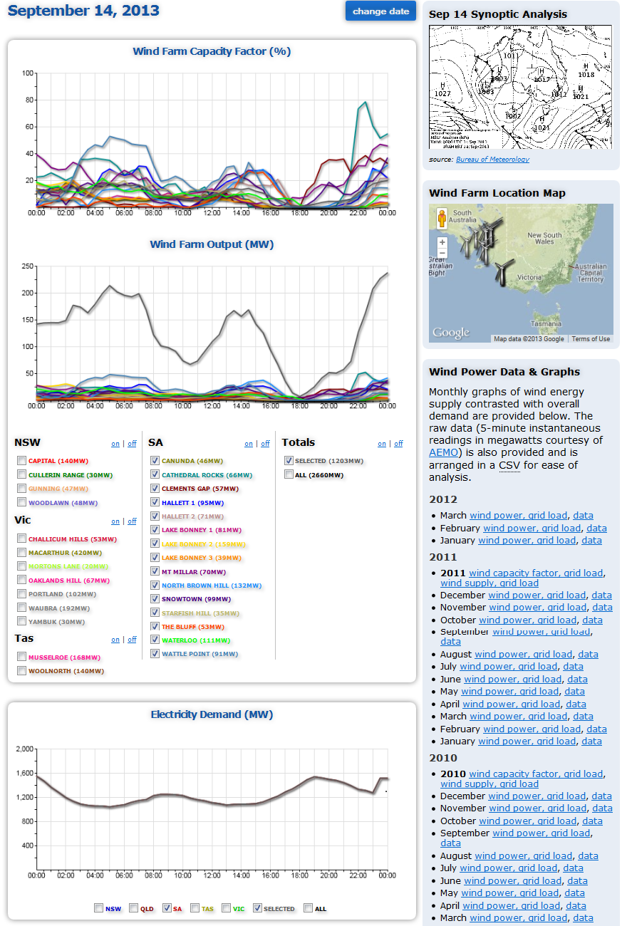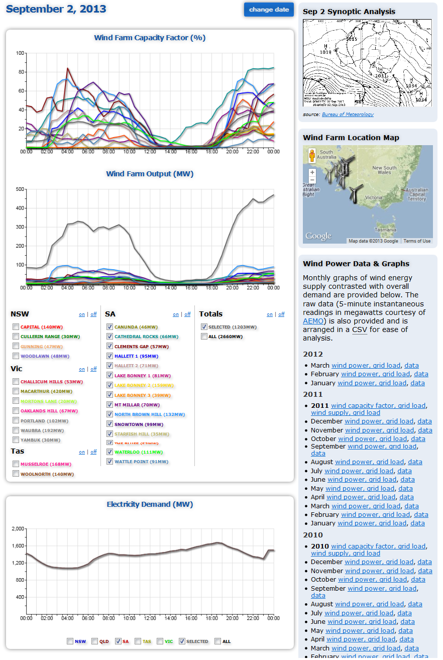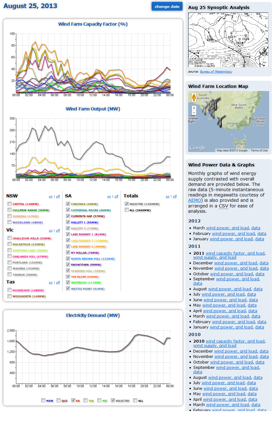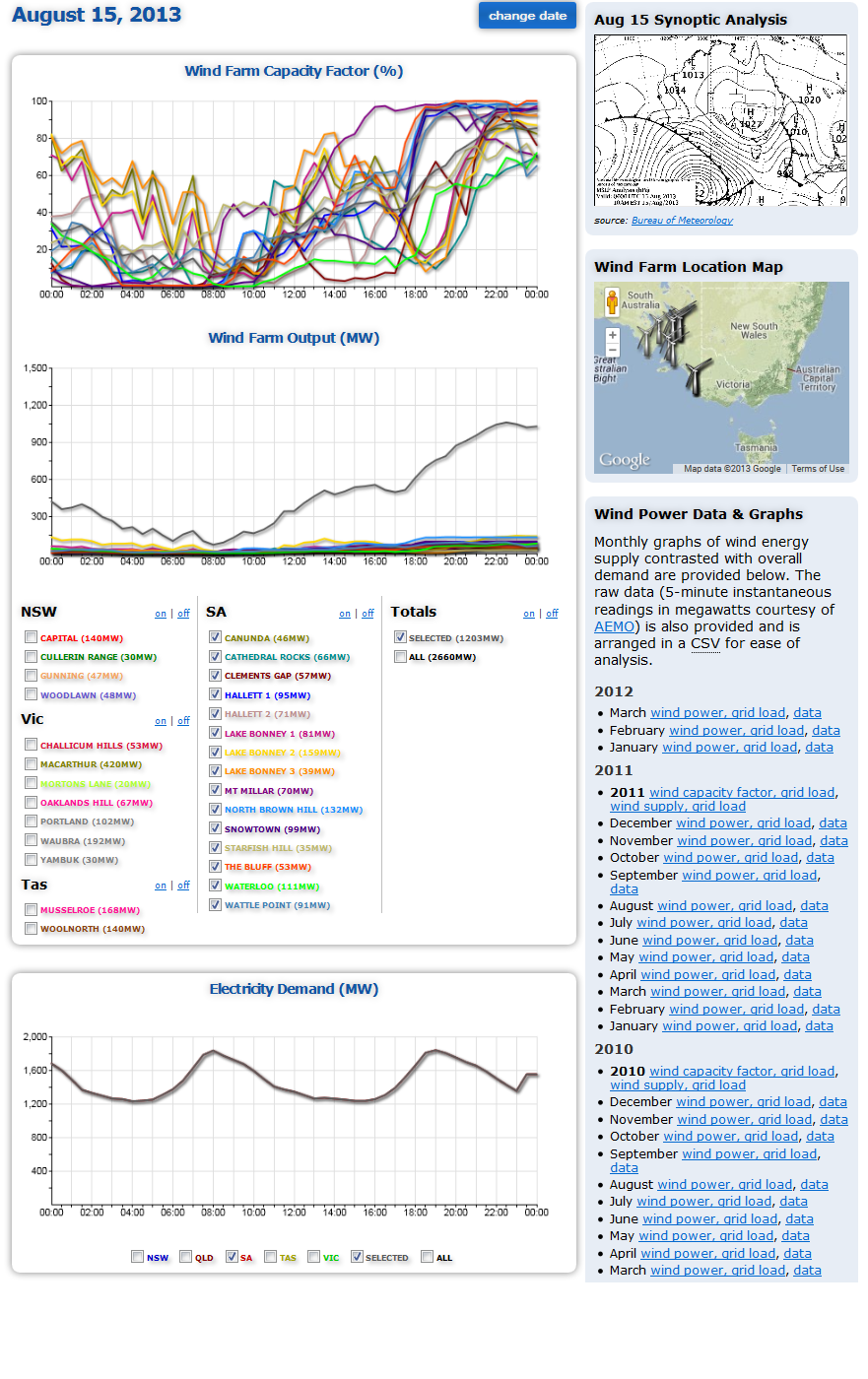 The middle graph shows the total output of all wind farms connected to the SA Grid in Megawatts (MW) over the course of the day.  All of the individual wind farms are identified below that.