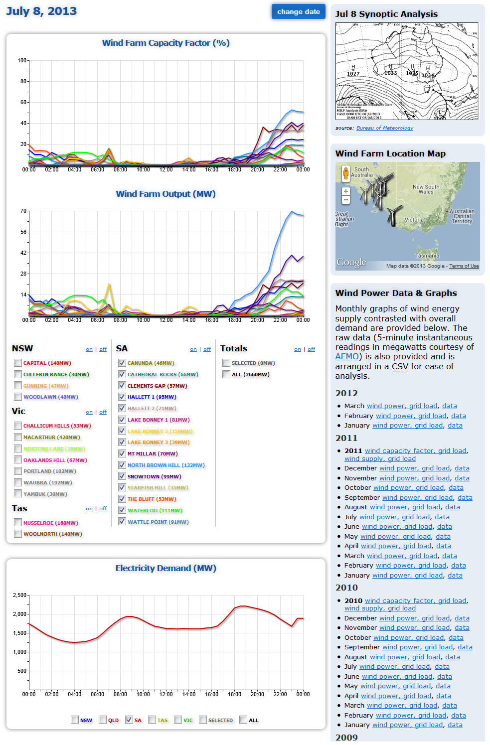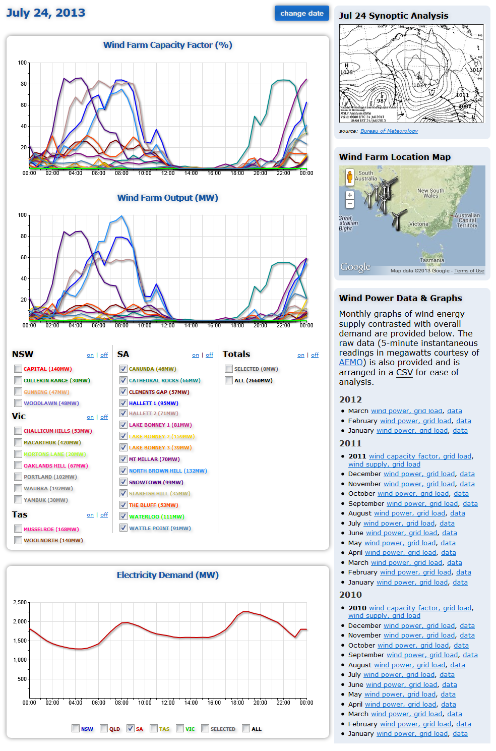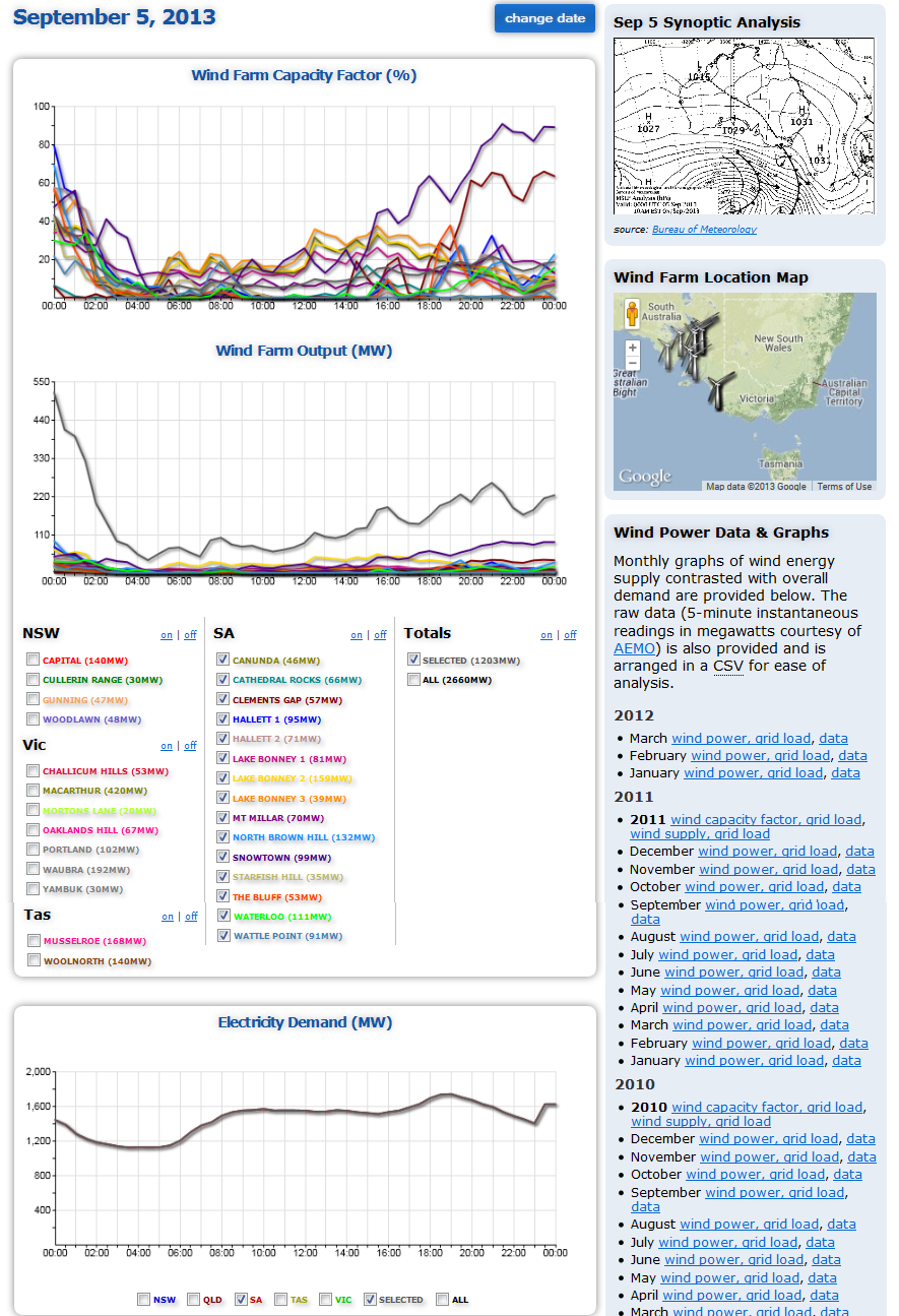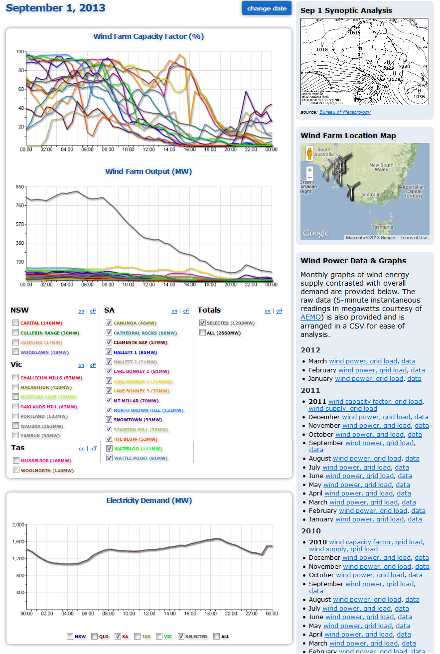 The middle graph shows the total output of all wind farms connected to the SA Grid in Megawatts (MW) over the course of the day.  All of the individual wind farms are identified below that.