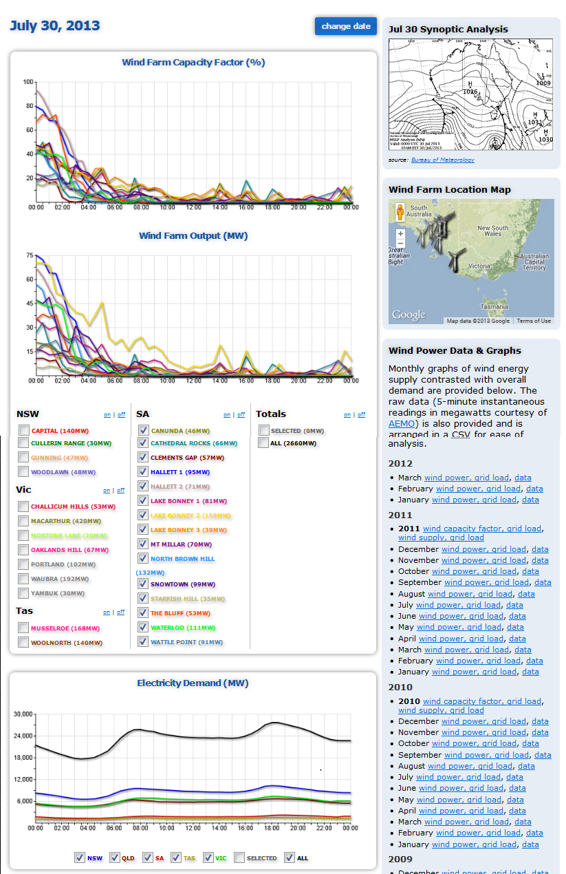 The one thing you will notice is that wind power output usually hits its straps at night which explains why people are being driven nuts at Waterloo, Waubra and MacArthur as they try to sleep.