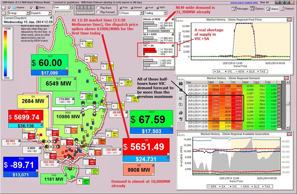 In the top-right graph above (the scale is $1,000 per MW/h – if it’s too small to read on your screen, click on it, it’ll pop up in a new window, then enlarge it) wind power’s extended absence without leave on 15 January occurred at precisely the same time as the dispatch price rocketed to the regulated cap of $12,500 per MW/h – the almost total collapse in national wind power output lasting for a very similar duration to the dispatch price spike.  Unlucky coincidence, perhaps?