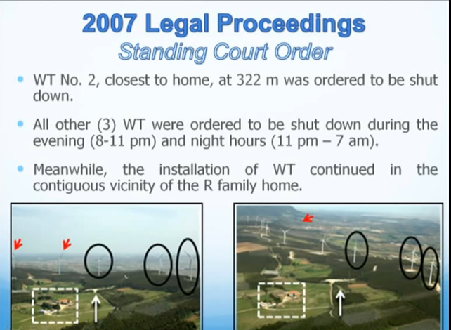 What is happening with the legal? This man, this family put the wind turbine developer in court. In 2007 as a precautionary measure, the court said, take out wind turbine 2 – as you can see the white arrow, there used to be a wind turbine there. The court said that one has to go. And the other 3 must be turned off at night. And while this court case was ongoing, the developer continued putting wind turbines all along (red arrows).