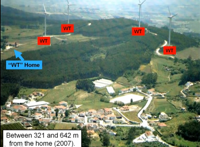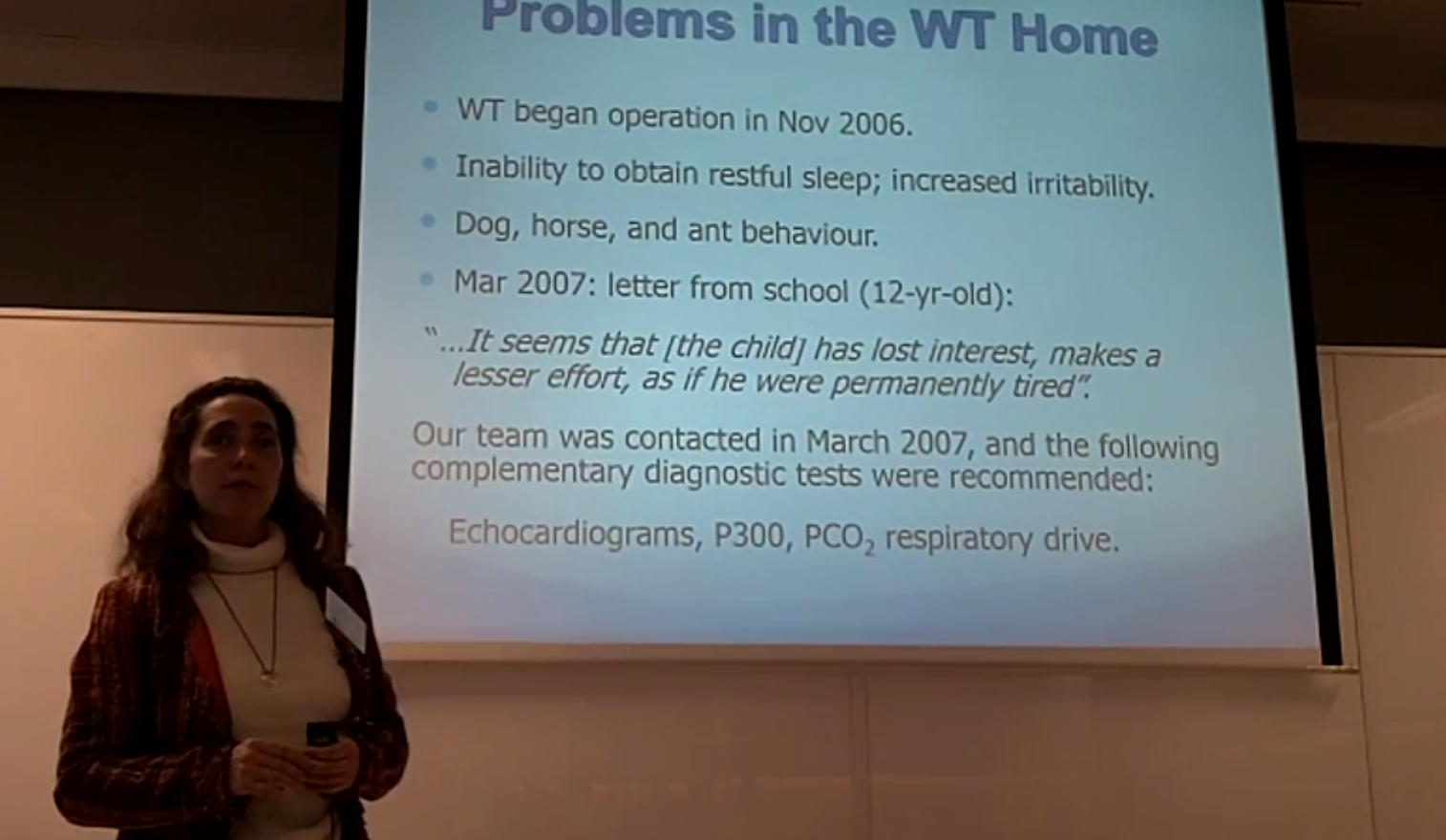 Late in 2013, Dr Alves-Pereira presented a case study from Portugal where a family was found to be exposed to LFN caused by the operation of nearby wind turbines (2006-2013). On-Off testing showed the increase in LFN inside the home was indeed associated with turbine operation. Medical tests showed the people who were living inside the home had impaired brain function in relation to responding to stimuli as well as their control of breathing.