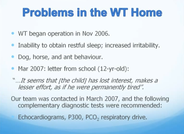 So what happened to this family? The wind turbines began operation in November 2006. Immediately the family recognised that they were waking up tired. The dogs that used to be jumping and always wanting attention were now sleeping. you had to step over them. The horses were lying down in their stable. And ants disappeared. In March 2007 the parents received a letter from the teacher of the boy, of the son, asking why this child was so tired now. He was losing all interest in school, he had no energy for physical education and a very good student was suddenly going down, down, down.