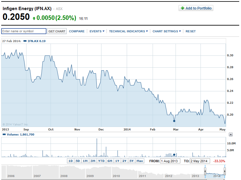 The drop seen above – from the year high of $0.32 (in August 2013) to $0.20 (now) – represents a 36% loss for investors who bought in at the top of the market this financial year. But spare a thought for those that bought in back in 2009 – when Infigen emerged from the ashes of Babcock and Brown: