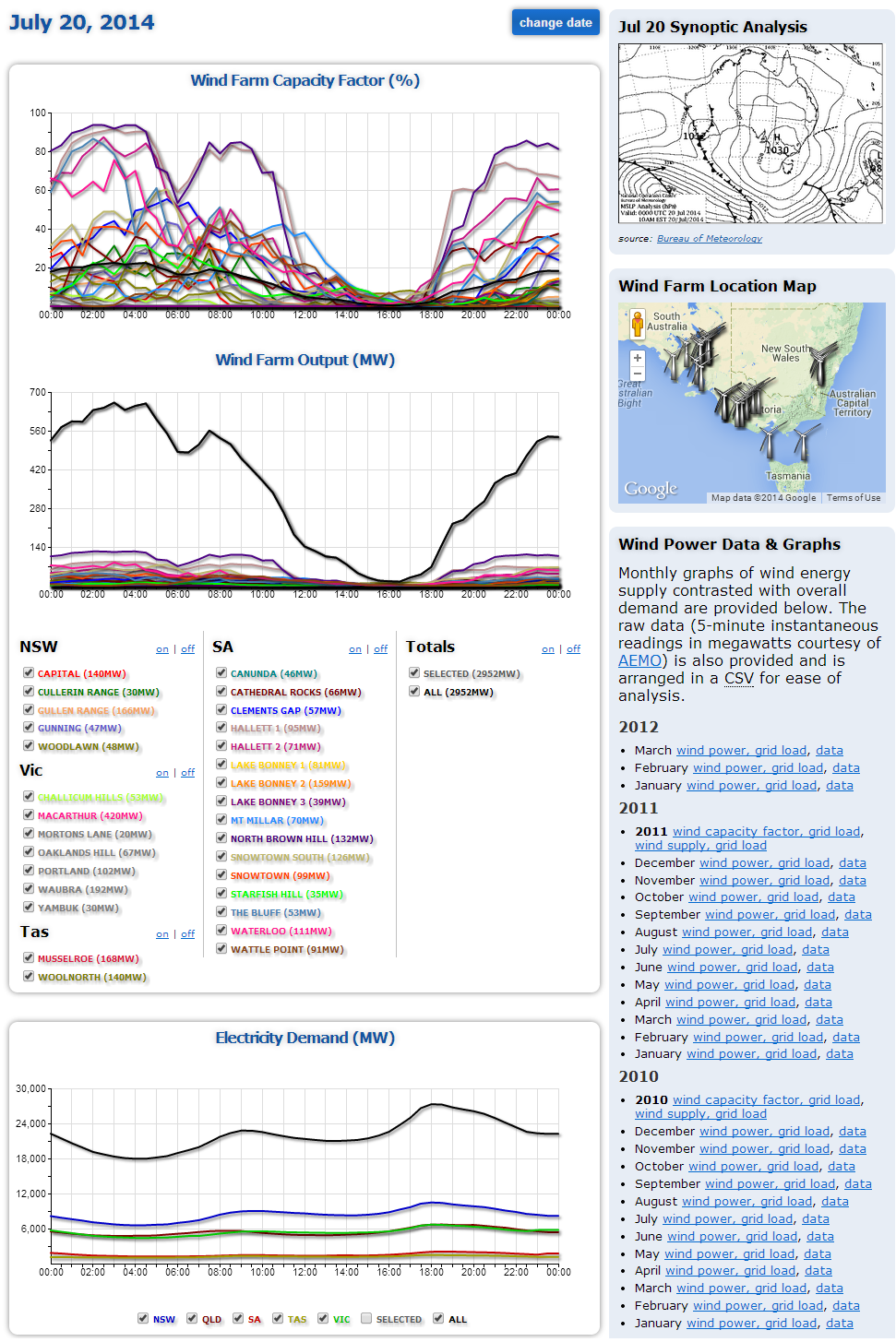 It’s quite happy to produce plenty of power when it’s not needed at night time; and much less during the day, when it is (as seen in the graph above); and often, none at all during periods of peak demand: as seen in the graph below, showing the entire fleet of wind farms connected to the Eastern Grid (based in SA, NSW, Tasmania and Victoria, which in July had a notional capacity of 2,952 MW) producing 20 MW or 0.67% of total capacity, just as demand starts to peak – and see our posts here and here and here and here and here and here and here and here.