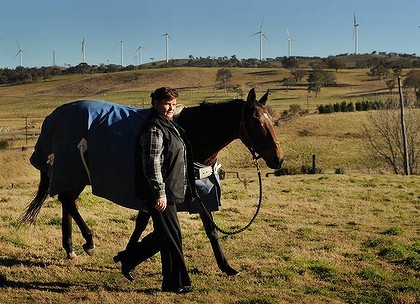 Michelle Edwards is an Irish-born thoroughbred horse trainer who operates from her property right next to Origin’s Cullerin windfarm, NSW.  Where 15 RePower MM82 and MM92 turbines have been driving her and her horses nuts since 2009.  Her horses are quite apparently bothered by noise from operating turbines (located on the range behind their property) and, in response to it, graze the paddocks they roam in as far away from the fans as possible – whenever the turbines are running.