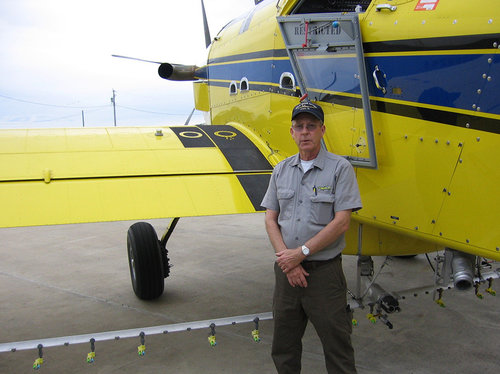 Missouri pilot Mike Lee stands next to a crop-duster. “I know some people who have had accidents. I’ve had friends that got killed in these things,” he says.