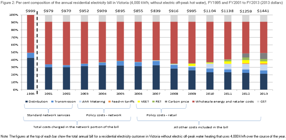 .. [T]he annual bill of the average Victorian residential electricity consumer on a single rate tariff using 4,000 kWh per year has increased by $442 from 1995 to 2013 – an increase of 44.2%. However, the different components of the bill have not changed at the same rate over that timeframe. Since 1995, network-related costs in total – including the cost of the Victorian Government’s smart meter program and solar feed-in tariff – have increased by only 3.0% – an increase of just $15 over those years. The non-network related components of the bill – the cost incurred by retailers in purchasing electricity from the wholesale market for use by residential customers and maintaining customers’ accounts, plus the costs of policy initiatives that affect the wholesale and retail portion of the bill – increased by $295 (58.4%) over the period.