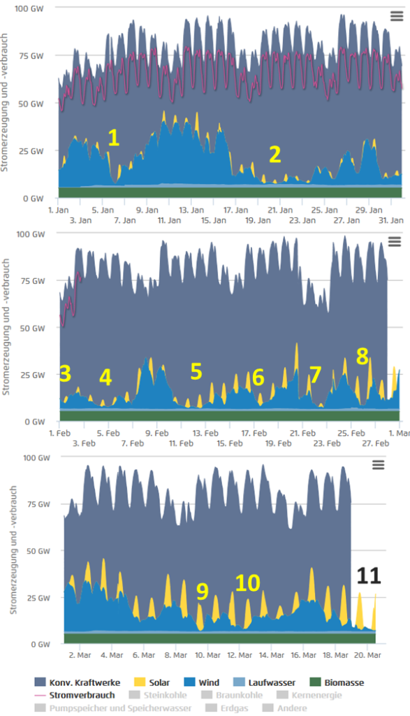 German wind and solar power disappeared this morning and over the last 36 hours, leaving fossil and nuclear power to step in to the rescue. The following chart of Germany’s energy supply and demand shows how wind has gone AWOL already 11 times since January 1 [click on the graph for a detailed view]: