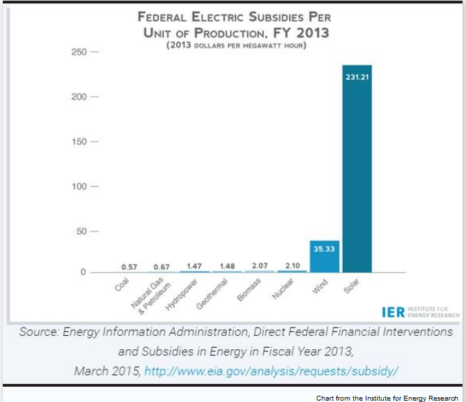 The IER calculated federal subsidies and support per unit of electricity production from the EIA charts and concluded that on a per dollar basis, the solar industry is subsidized 345 times more than coal and oil and natural gas electricity production, and wind is subsidized 52 times more than more conventional fossil fuels.