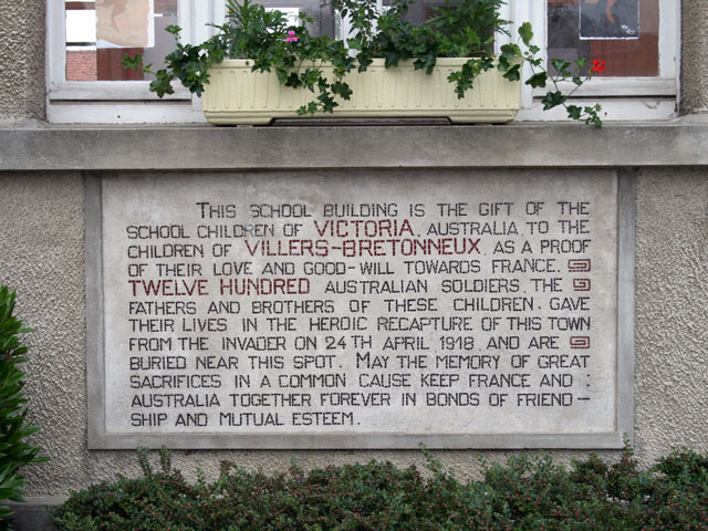 In the fearless recapture of towns like Villers-Bretonneux – an action involving a counter-attack at night, without artillery support – described by those that witnessed it as “the Most Brilliant Feat of Arms in the War” – the AIF earned the enduring respect of an embattled French people who, as this sign above the playground in their school declares, will never forget what was done by so many fine young men, so far from home.