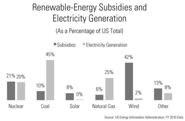 In 2010 the wind energy sector received 42% of total federal subsidies while producing only 2% of the nation’s total electricity. By comparison, coal receives 10% of all subsidies and generates 45% and nuclear is about even at about 20%.