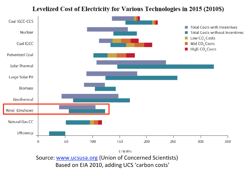 Wind turbines have become a familiar sight in many countries as a favorite CAGW mitigation means. Since at least 2010, the US Energy Information Agency (EIA) has been assuring NGOs and the public that wind would be cost competitive by now, all things considered. Many pro-wind organizations claim wind is cost competitive today. But is it? [if any of the graphs below look fuzzy, click on them and they’ll pop up clear as crystal in a new window]