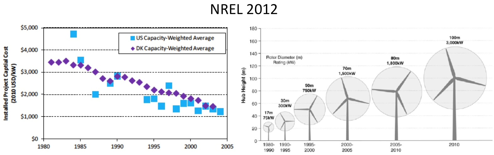 But actual installed cost/MW stopped declining, and started rising around 2005. There are few onshore turbines larger than 3 MW because of transportation (road/rail) constraints on blade length. The above 2012 NREL composite chart is deliberately misleading; it ended in 2005 although LBNL data was available to 2011.