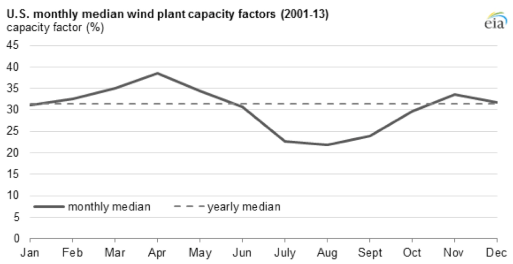 The record US annual wind capacity factor was 2014 at 33.9%. EIA itself says the median CF over the past decade is 31%. (Still better than the UK, where CF ranged from a low of 21.5% in 2010 to a record high 27.9% in 2013.) The assumed US 35% CF is unrealistically optimistic. [3]