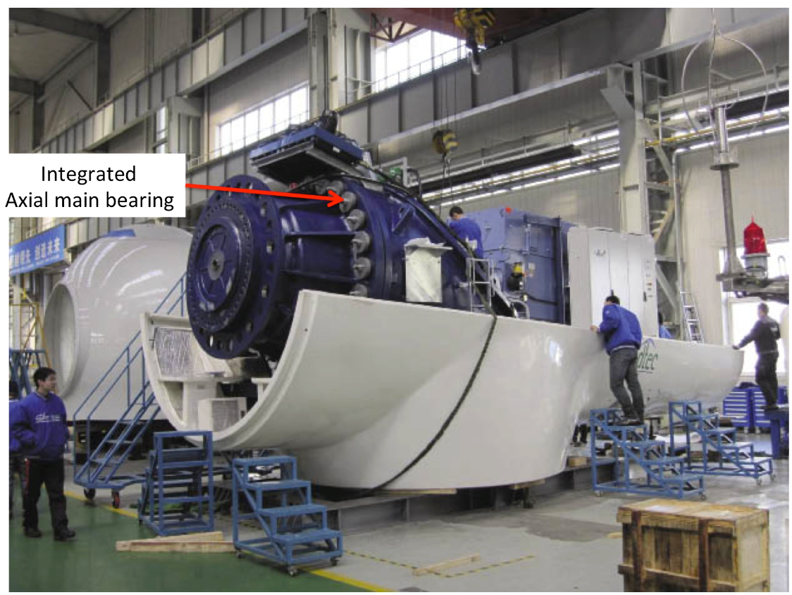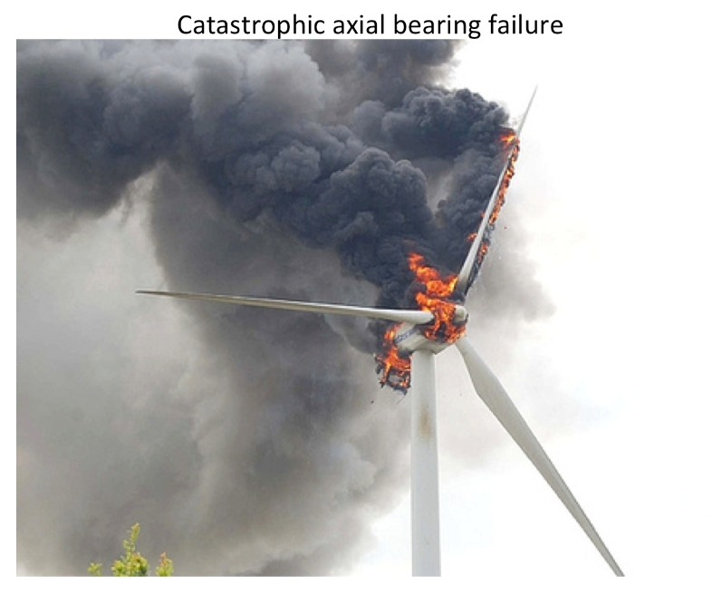 Studies of UK and Denmark wind farms suggest their actual economic lives appear to be 12-15 years due to wear and tear.[4] One of the unanticipated problems that arose with larger turbines is premature cracking failure of the main axial bearing(s). These failures arise from two very difficult engineering conditions. First is uneven loading. Wind speeds increase with altitude so the three blades, which span great distances, are never evenly loaded. The bearing(s) wobble under the tremendous forces generated. Second, braking when wind speed exceeds 25mph suddenly loads reverse torque on the axial side where previously unloaded (and wobbling) individual bearings are in natural misalignment to their trace. If things go ‘well’, cracking can be caught before catastrophic failure. It is expensive to repair. The blades must be detached so the turbine can be dismounted and sent back to the factory. The following image shows a 3MW unit.