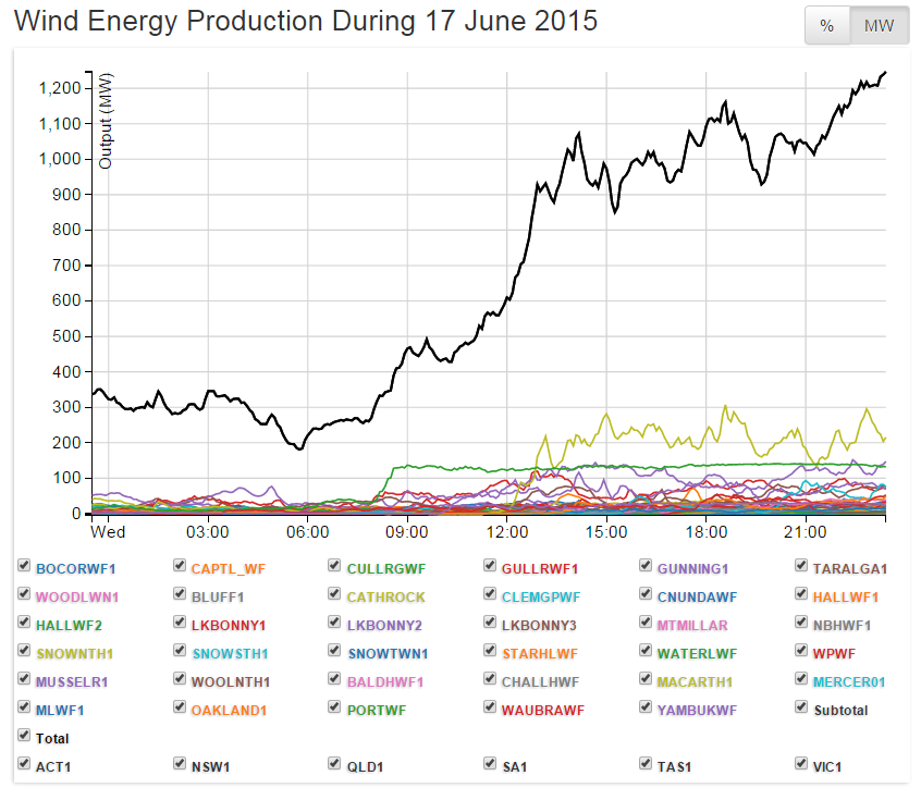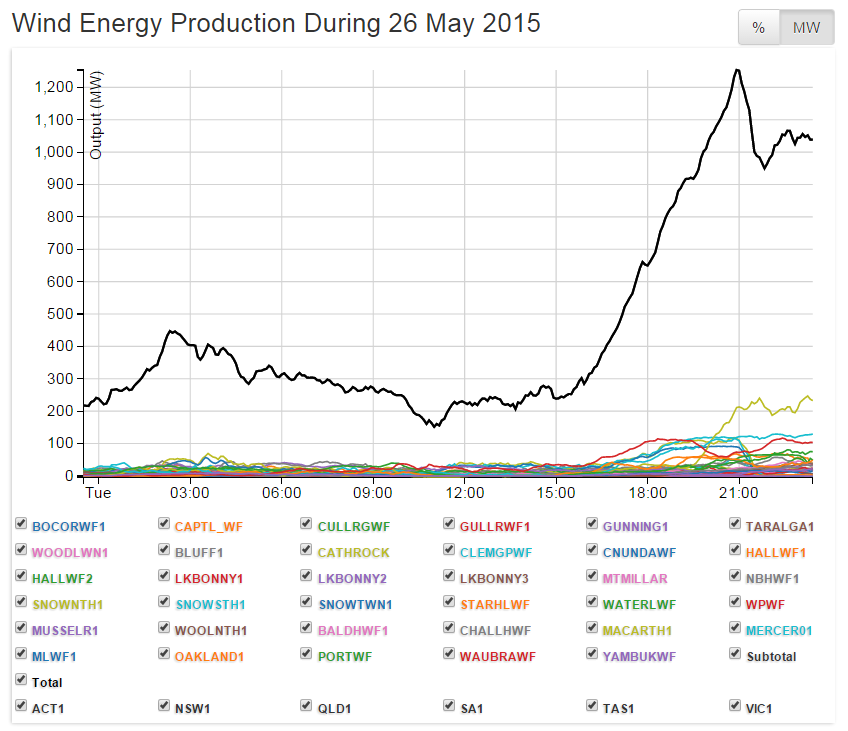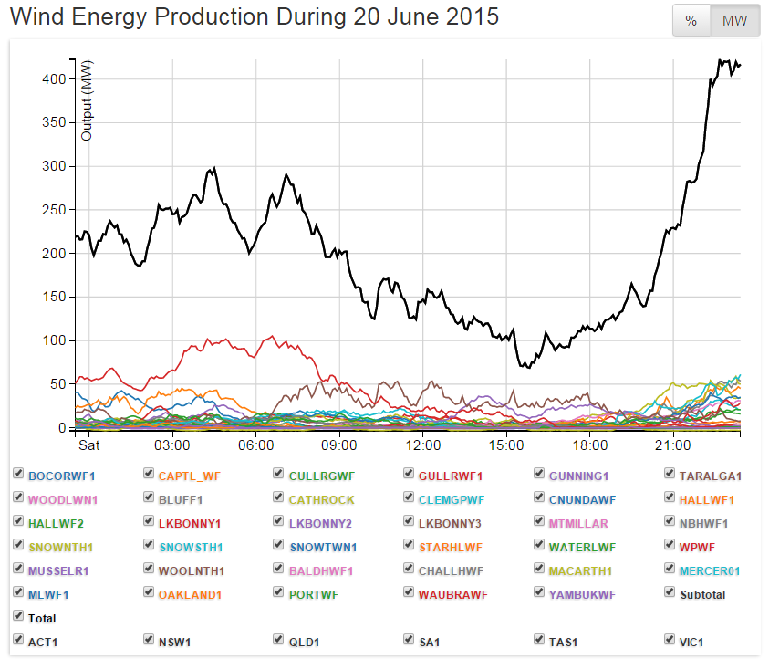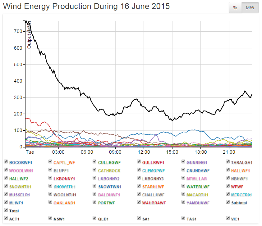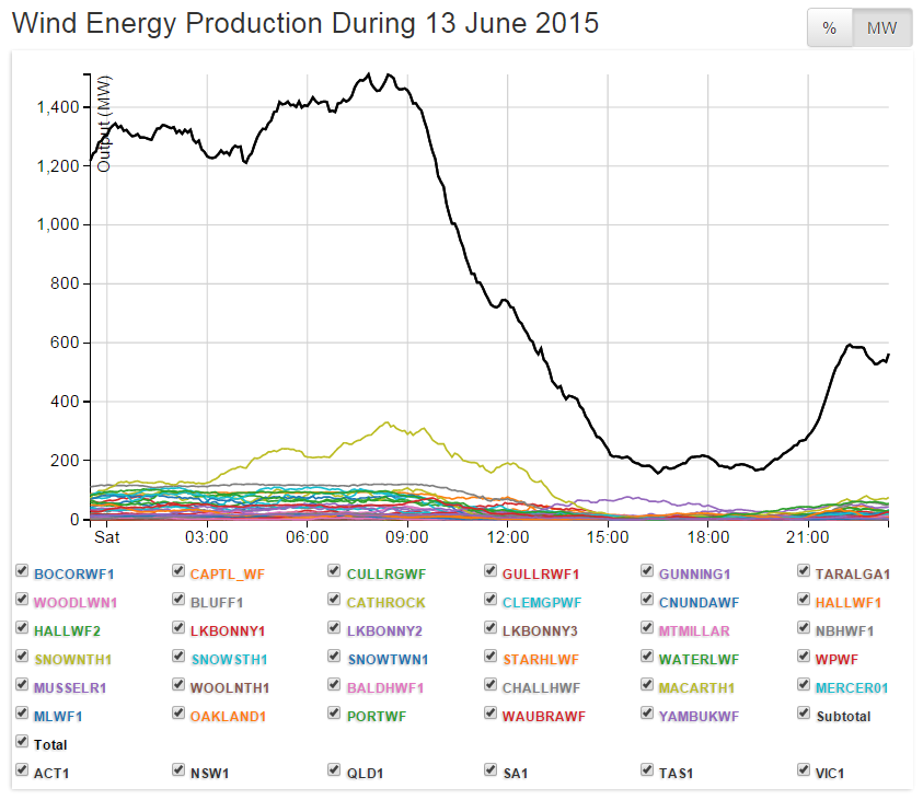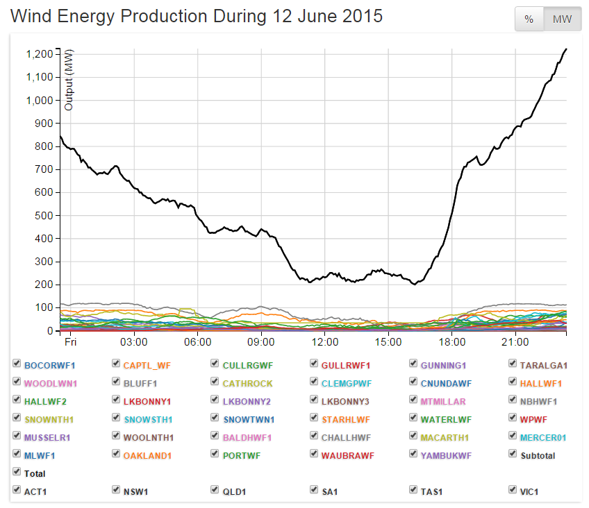 Output as a percentage of total installed wind farm capacity: 10am to midnight – 5%; and 1pm to 4pm – less than 2.5%.