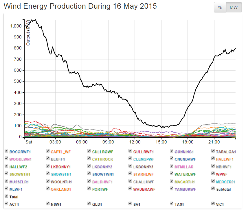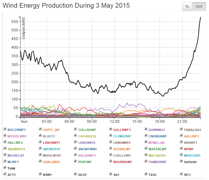 Output as a percentage of total installed wind farm capacity: 8am to 10pm – 5%; falling to 3.75% – at 3pm.