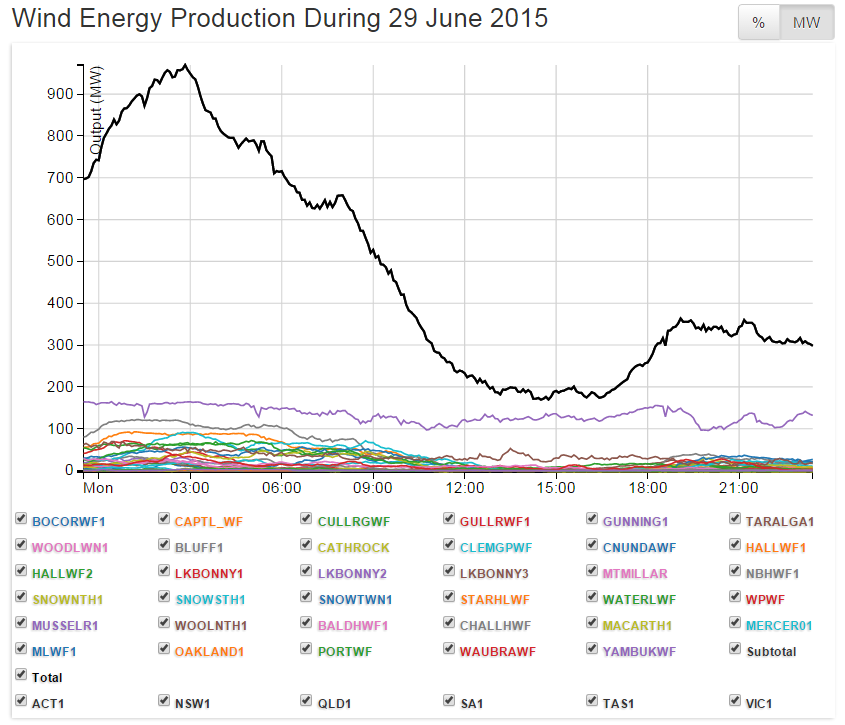 Entire Eastern Grid – 29 June 2015 – a drop of 800MW – from 1,000MW to less than 200MW from 3am to 1pm – an 80% collapse in output. From midday to 5pm (5hrs) and 6pm to midnight (6hrs):