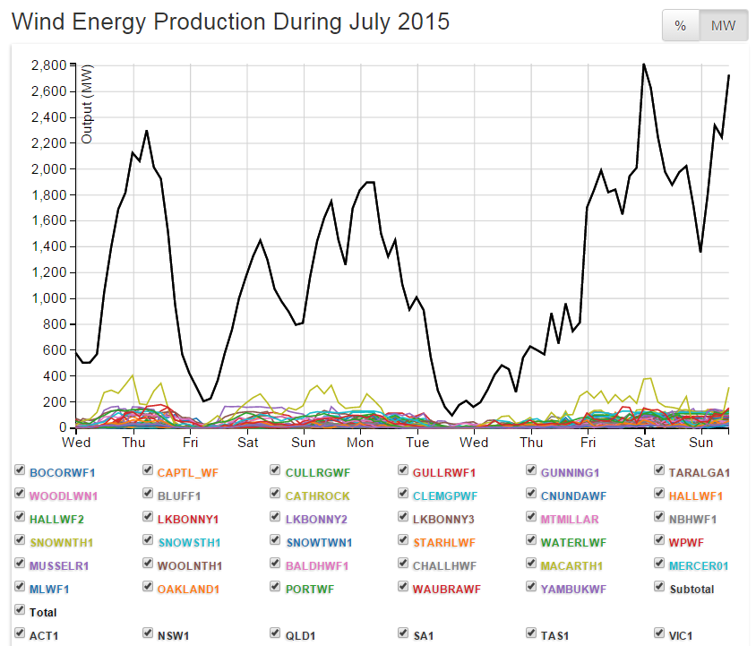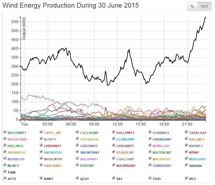 Here’s the total output from all wind farms on the Eastern Grid for the start of July 2015.