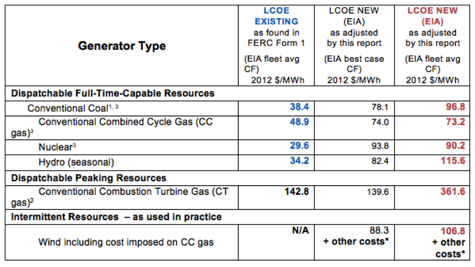 EIA notes that “The LCOE values for dispatchable and nondispatchable technologies are listed separately in the tables, because caution should be used when comparing them to one another.” This is because wind is, by its nature, not reliable. The wind doesn’t always blow. In order to make more apples-to-apples comparisons with other sources of generation, we needed to make some adjustments to EIA’s estimates to reflect wind’s unreliability and need for back up when the wind isn’t blowing.
