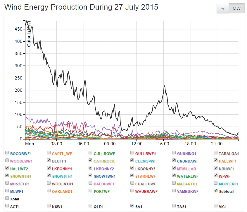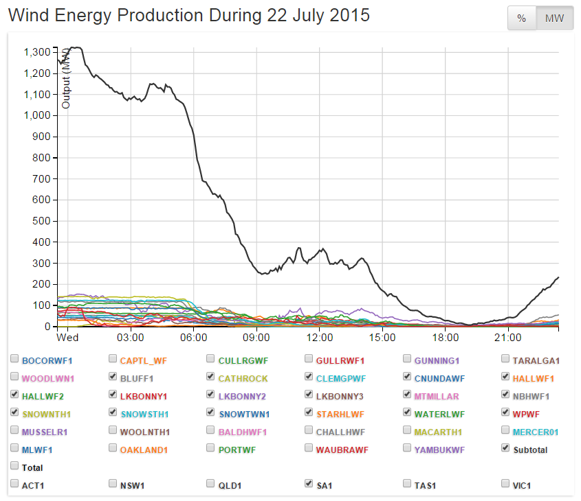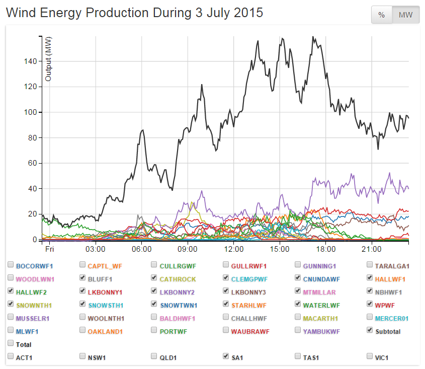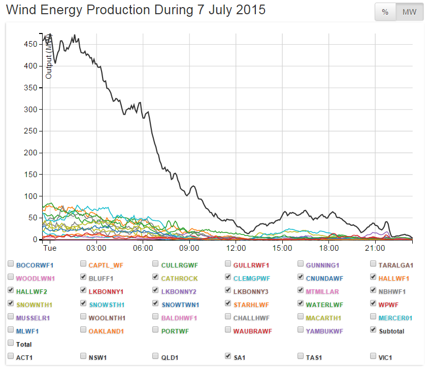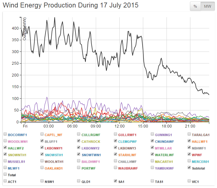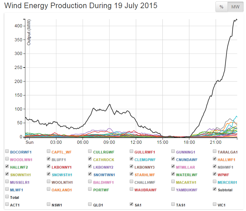 Wind generation in South Australia was approximately 120 MW for TI ending 0000 hrs on 18 July 2015.