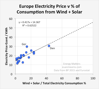 Figure 2 This plot is a variant of Figure 1 where wind+solar consumption as a proportion of total electricity consumption is plotted on the x-axis. Linearly extrapolating to 100% indicates a price of €cents55 for a 100% renewable system. Germany stands out as an anomaly on this chart, no longer alongside Denmark. This is perhaps due to German wind having a lower load factor. It could also reflect German wind exports and or curtailments.