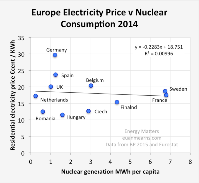 Figure 4 Analogous plot to Figure 1 but for nuclear. There is no correlation between the level of nuclear penetration and price although high nuclear France, Sweden and Finland have significantly lower prices than low nuclear Germany.