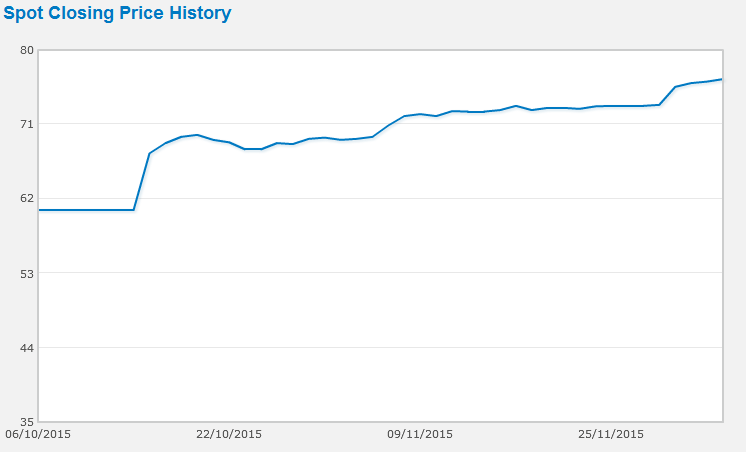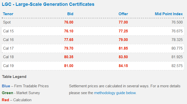 The REC market has taken a recent ‘kick’, as those holding them have been sitting back and watching the price rise; and they are likely to wait until the penalty set by the LRET kicks in, before they cash in their stockpiles at prices of over $90 (many were purchased at $20 or less). Trading at less than $30 last year, they’ve spiked to around $75 in recent weeks, and the forward market has them trading above $83.