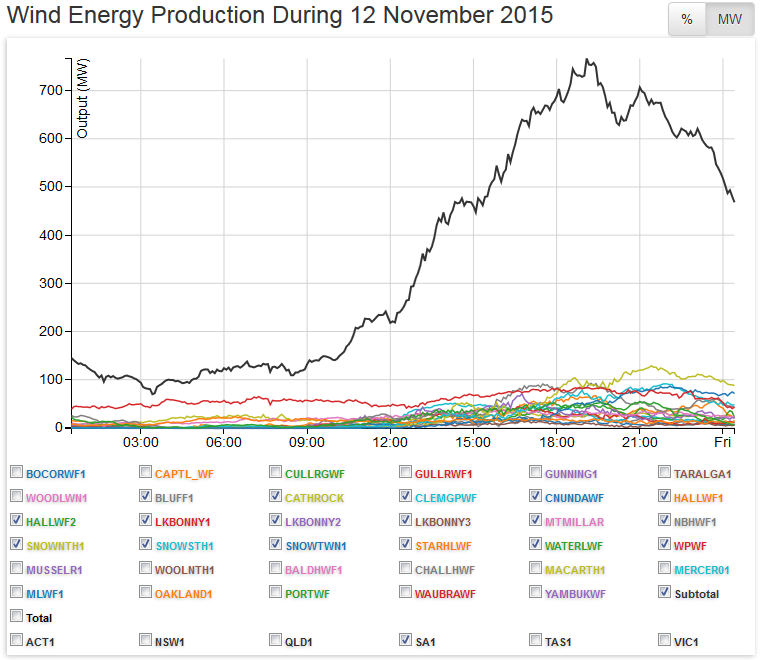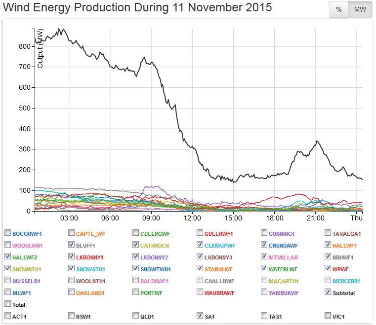 At times the price dropped below zero. But on Wednesday [11 November – see below] and Thursday [12 November – see below] the wind suddenly abated, and the turbines ground to a lazy halt. Wind energy production dropped to a fraction of demand, and the high voltage interconnector to Victoria’s brown coal power – the usual standby – cut out too.