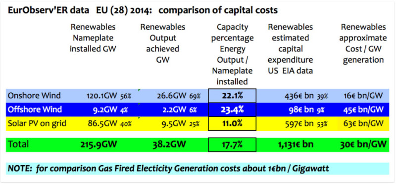 The combination of the capacity along with factors and the US EIA costing comparisons, along with the EurObseER data in the following table summarises the situation of Renewables in Europe.