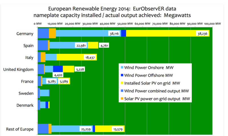 Germany with a commitment to ~37% of all European Renewable installations by 2014 had the least performant Renewable industry in Europe, (an overall capacity 13.2%). This is mainly because of the huge commitment in Germany to Solar power, 42% of all European installations. This has to be driven by a misconception simply because Germany is a cloudy Northern European country. Spain, the UK and Denmark have much better performance rates, but they have much lower commitments to Solar power and in the case of the UK a higher commitment to Offshore wind power.