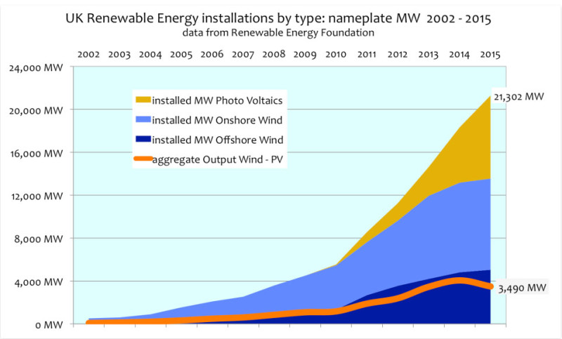 This article is concerned with the two main forms of weather dependent Renewable Energy, Wind Power (Onshore and Offshore) and Photovoltaic solar power. In the UK this amounts to ~75% of all installed Renewable Energy. The other renewable energy inputs are traditional Hydro power ~8% and the remainder are other sources such as biomass, waste and landfill gas amounting to ~17%.