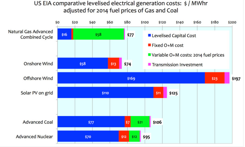In summary this table assembled in 2013 can be condensed into the following graphic for comparative cost purposes showing the capital and running cost implications measured as $/MWhr.