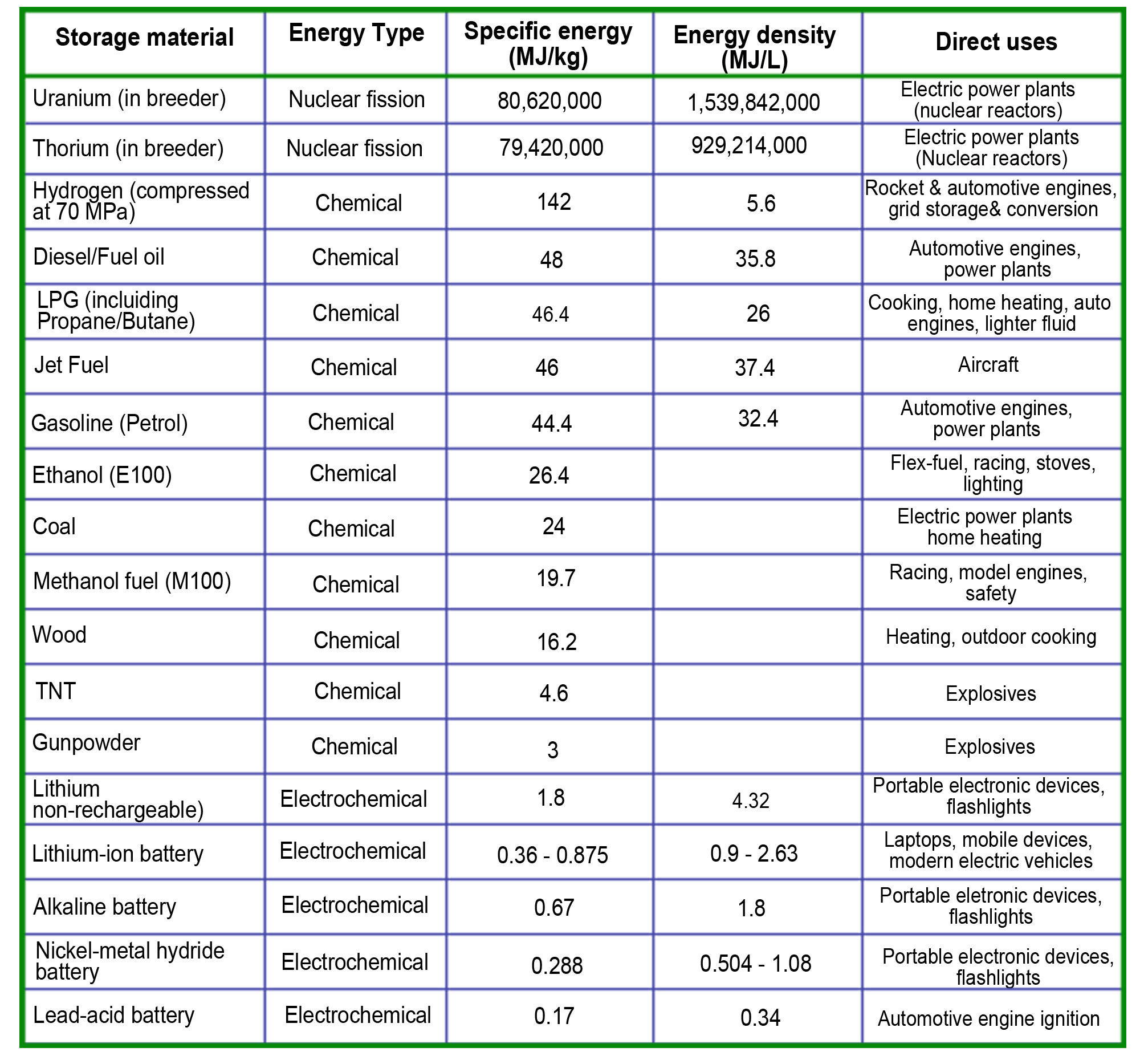 Energy density is the amount of energy stored in a given system or region of space per unit volume. Specific energy is the amount of energy stored per unit mass (weight.) Only the useful or extractable energy is measured. It is useful to compare the energy densities of various energy sources. At the top of the list is fusion followed by nuclear fission and then hydrocarbon fuels derived from petroleum, coal and natural gas. At the bottom of the list are batteries which either generate energy or store energy as well as “renewable energy” such as solar.