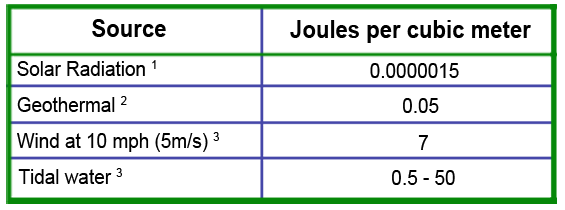 3 Wind is driven by changes in weather patterns, which in turn are driven by thermal gradients. Tides are driven by fluctuations in gravity caused by lunar revolutions. The energy densities of wind and water systems are proportional to the mass, m, moving through them, and the square of the speed, v, of this mass, or ½mv2. At sea level, air with a density of about one kilogram per cubic meter moving at five meters per second (ten miles per hour) has a kinetic energy of 12.5 joules per cubic meter. Applying Betz’s Law, which limits efficiency to 59% (Betz 1926), yields about seven joules per cubic meter. Thus, wind energy on a moderately windy day is over a million times more energy-dense than solar energy.