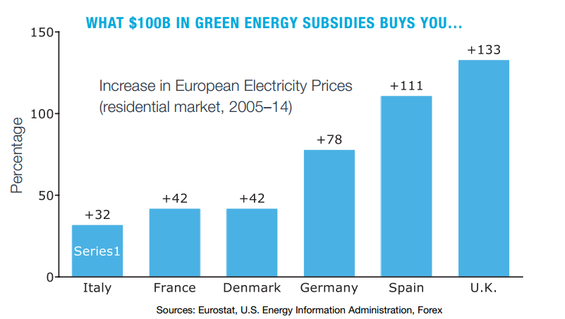 • During 2008–12, Germany’s residential electricity rates increased by 78 percent, Spain’s rose by 111 percent, and the U.K.’s soared by 133 percent.