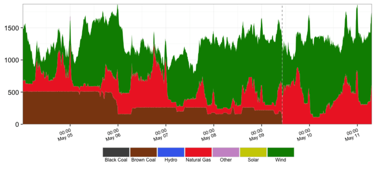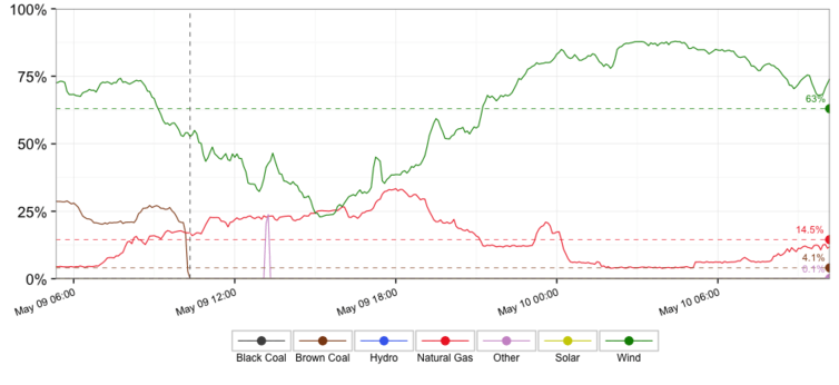 [South Australian power dispatch as a percentage of total coloured by fuel type for the period ~ 5:00 am May 9 through to 10 am Monday 10th. Data sourced from AEMO. Units in megawatts. Time is in NEM-time corresponding Australian Eastern Standard time. The vertical dashed line marks the shutting off of the Northern Power station, and the last coal dispatch within South Australia.]