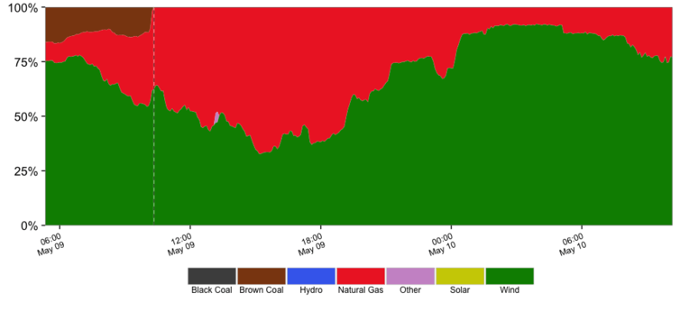 [South Australian power dispatch as a percentage of total coloured by fuel type for the period ~ 5:00 am May 9 through to 10 am Monday 10th. Data sourced from AEMO.]