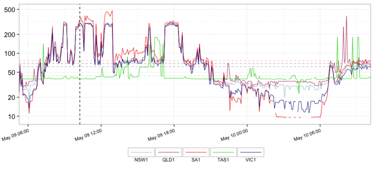[5-minute spot prices for the period ~ 5:00 am May 9th through to 10 am May 10th, coloured by NEM region. Units are dollars per megawatt hour. Data sourced from AEMO.]