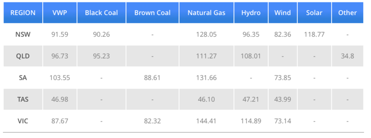 [Volume-weighted wholesale power prices for the period ~ 5:00 am May 9 through to 10 am Monday 10th, by region and by fuel type. Units are dollars per megawatt hour. Data sourced from AEMO.]