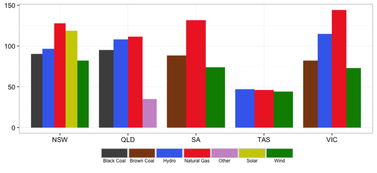 With power flows across the nation responding to the changing circumstances in South Australia, connected markets followed the merry dance. Across the mainland states, wholesale prices averaged a bit over $90 per megawatt hour across the 29 hour period shown here, about double what we would expect for a typical Autumn weekday. Natural gas did particularly well, returning an average of more than $100 in each of the mainland jurisdictions.