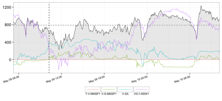 [Power flows across the interconnectors linking Victoria to South Australia (V-S-MNSP1 & V-SA) and to New South Wales (VIC1-NSW1). Note that for time period here, Basslink (V-T-MNSP1) linking Victoria and Tasmania was not operational. Exports are listed as positive values, imports as negative values. Combined total in black. Units are megawatts. Data sourced from AEMO.]