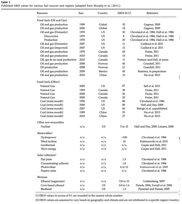 Most of the data in the following charts comes from Hall et al 2014 who summarise ERoEI research for a variety of fossil fuels and renewable energy flows (see table below) [2].
