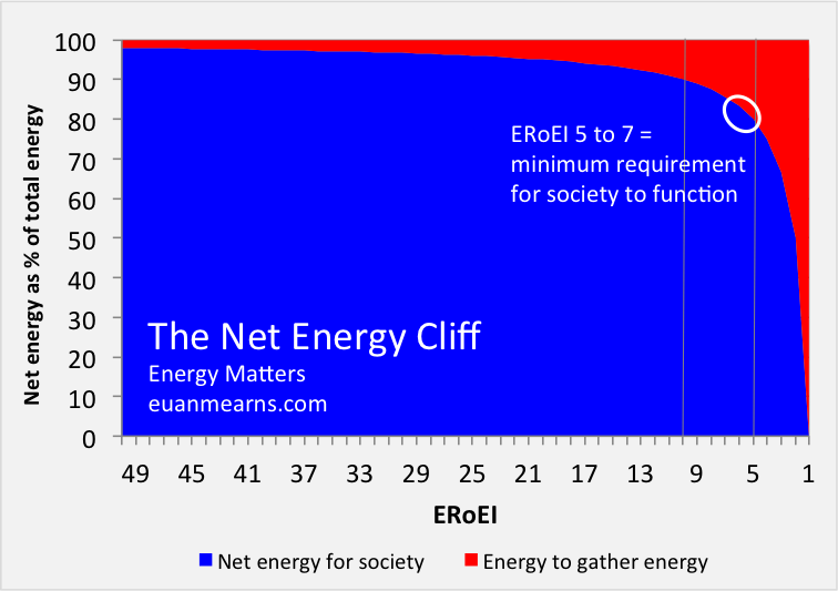 It has been assumed by many that ERoEI > 7 was required for the industrial society we live in to function although the source of this assertion remains elusive. But the blue-red boundary provides a clear visual picture of why this may be so. Below 7 and humanity falls off the net energy cliff where a too large portion of our human resources and capital need to be invested in simply staying alive to the detriment of the services provided by net energy such as health care, education and pensions.