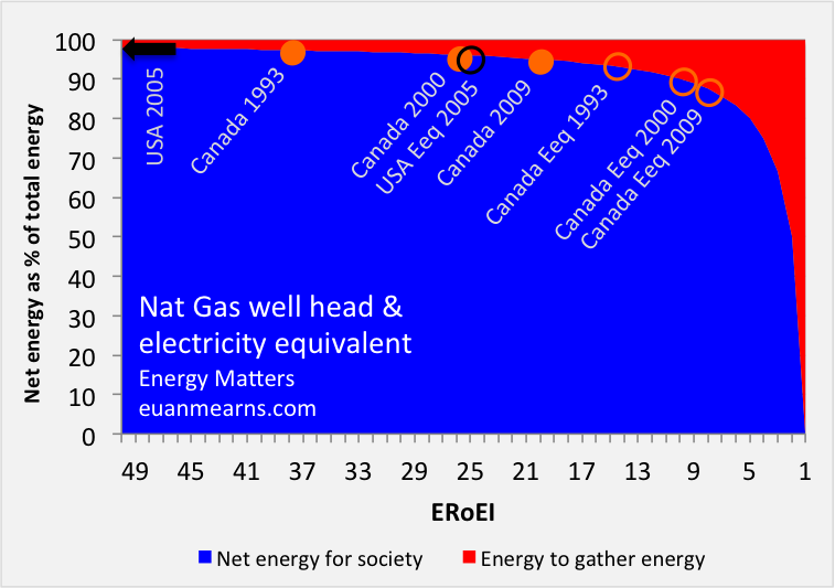 In 2005 (pre-fracking) US natural gas had high ERoEI of 67. Freise (2011) charts the decline in Canadian gas ERoEI from 38 in 1993, to 26 in 2000, to 20 in 2009. This march towards lower ERoEI in Canada is sending Canadian gas Eeq towards the net energy cliff edge. Large quantities of natural gas in Canada are used in tar sands extraction and upgrading. High ERoEI gas is being traded for liquid fuel that has ERoEI of about 3 (own calculation based on published Canadian statistics).