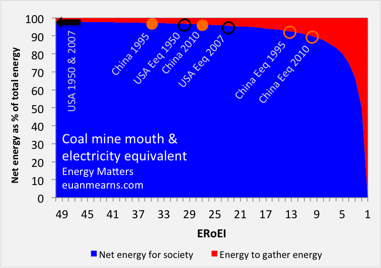 Hall et provide ERoEI data for the USA and China. US coal has very high ERoEI of 80 in 1950 and 60 in 2007. The fall is only slight and that is because mining methods have not changed very much. US coal is mainly surface mined from vast surface deposits in the Appalachians and Wyoming. By comparison, Chinese coal had ERoEI of 35 in 1995 and 27 in 2010. The lower ERoEI of Chinese coal to large extent reflects underground mining compared with surface mining in the USA. The Chinese need to apply vast effort to extract and transport coal to drive their economy.