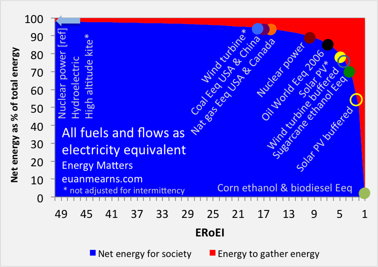 The prosperity of humanity depends upon the efficiency with which we gather energy. 100 years ago and 50 years ago we hit several jackpots in the form of vast coal, oil and gas deposits. These were so rich and large that energy virtually spewed out of them for next to no energy or financial investment. Examples include the Black Thunder coal field (USA), the Ghawar oil field (Saudi Arabia) and the Urengoy gas field (Russia) to name but a few. But these supergiant deposits are now to varying degrees used up. And as global population has grown together with expectations of prosperity that are founded on energy gathering activities, humanity has had to expand its energy gathering horizons to nuclear power, solar power and energy from waste. And it is known that some of the strategies deployed have very low ERoEI, for example corn ethanol is around 1 to 2 [2] and solar PV between 1 and 5 [2,3] depending upon where it is sited and the boundaries used to estimate energy costs. Consider that an ERoEI greater than 5 to 7 is deemed necessary to sustain the society we know (see below) then it is apparent that we may be committing energy and economic suicide by deliberately moving away from fossil fuels.