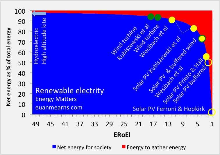The inclusion of high altitude kite is based on a calculation provided by site sponsor KiteGen. I have checked the calculation and am satisfied that the ERoEI is potentially >>50. This will be the subject of another post. But suffice to say here that wind speed at altitude may be double that on the ground and power increases by the cube of wind speed. And the mass of the KiteGen structure is a small fraction of a large wind turbine. Hence it is theoretically straightforward to reach an ERoEI at altitude that is many multiples of the ERoEI of a wind turbine.