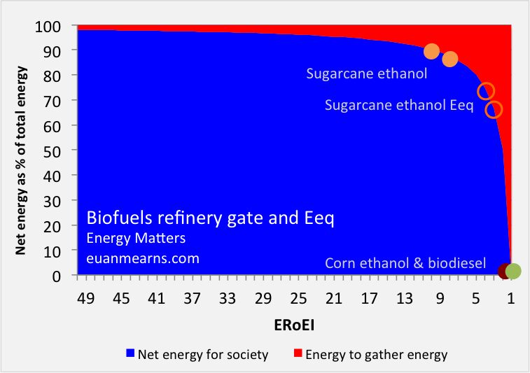 Sugarcane ethanol in Brazil has ERoEI of 8 to 10 at the refinery gate which at face value seems OK [1]. But to be equitable with its FF cousins this needs to be reduced to 3 to 4 in Eeq form and is barely viable. Temperate latitude biofuels are not viable in liquid form at the refinery gate and converting them to Eeq cripples them completely. But I suppose burning them to make electricity is no less crazy than burning them in an internal combustion engine sat idle at traffic lights.